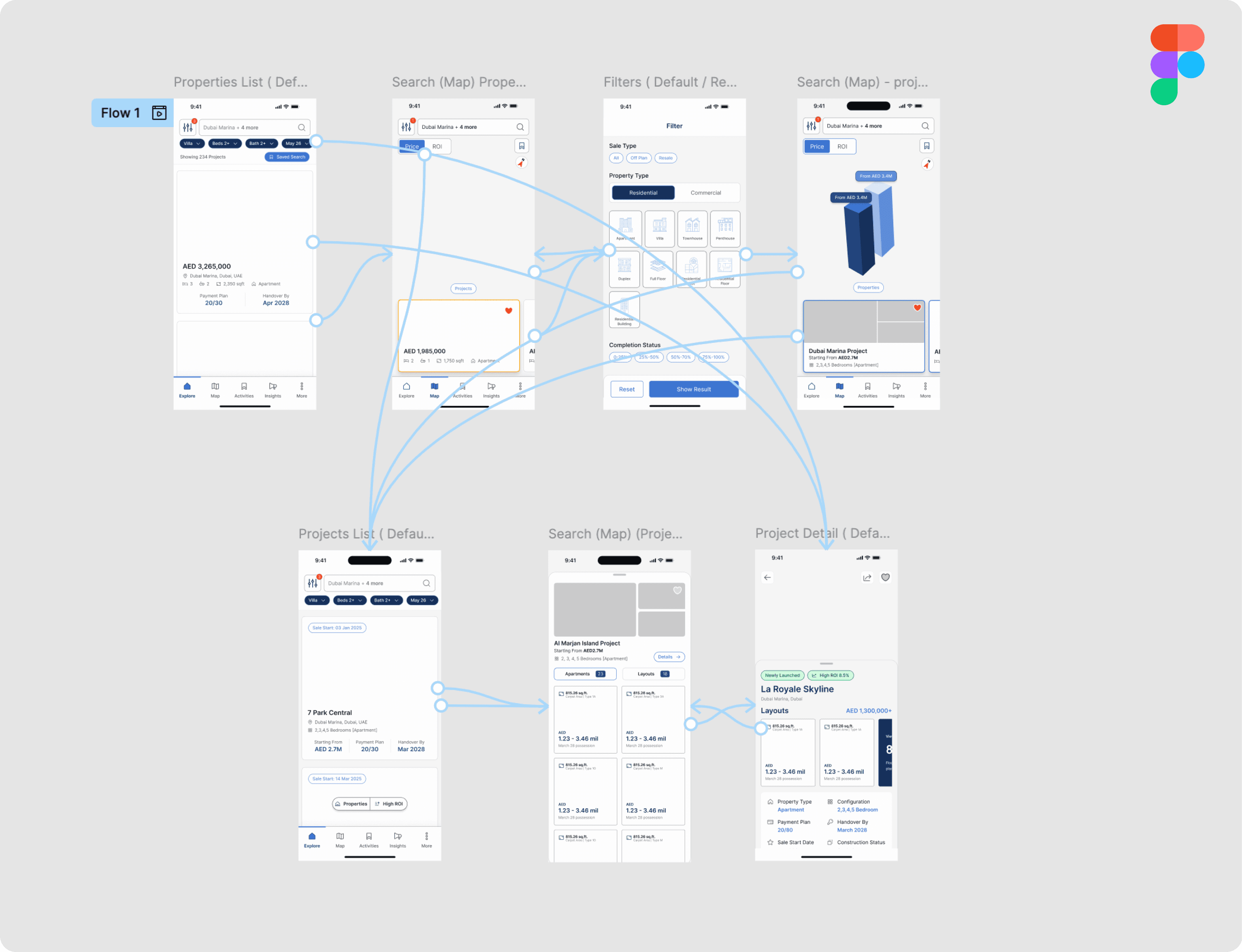 The platform included over 500+ screens, covering multiple user journeys from property discovery to detailed listings and user interactions.